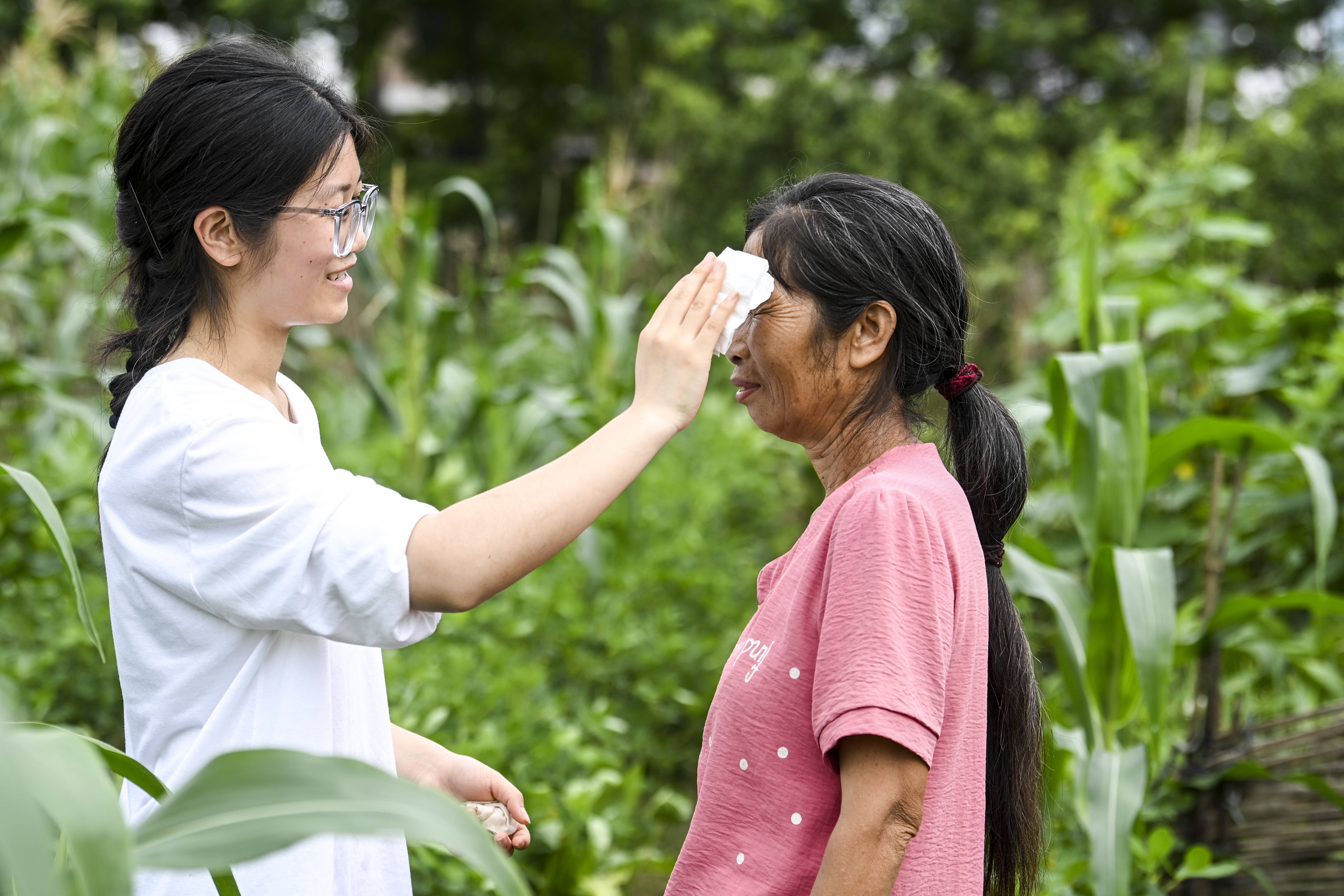 2025年6月13日,刘燕在农忙之余给妈妈擦汗。