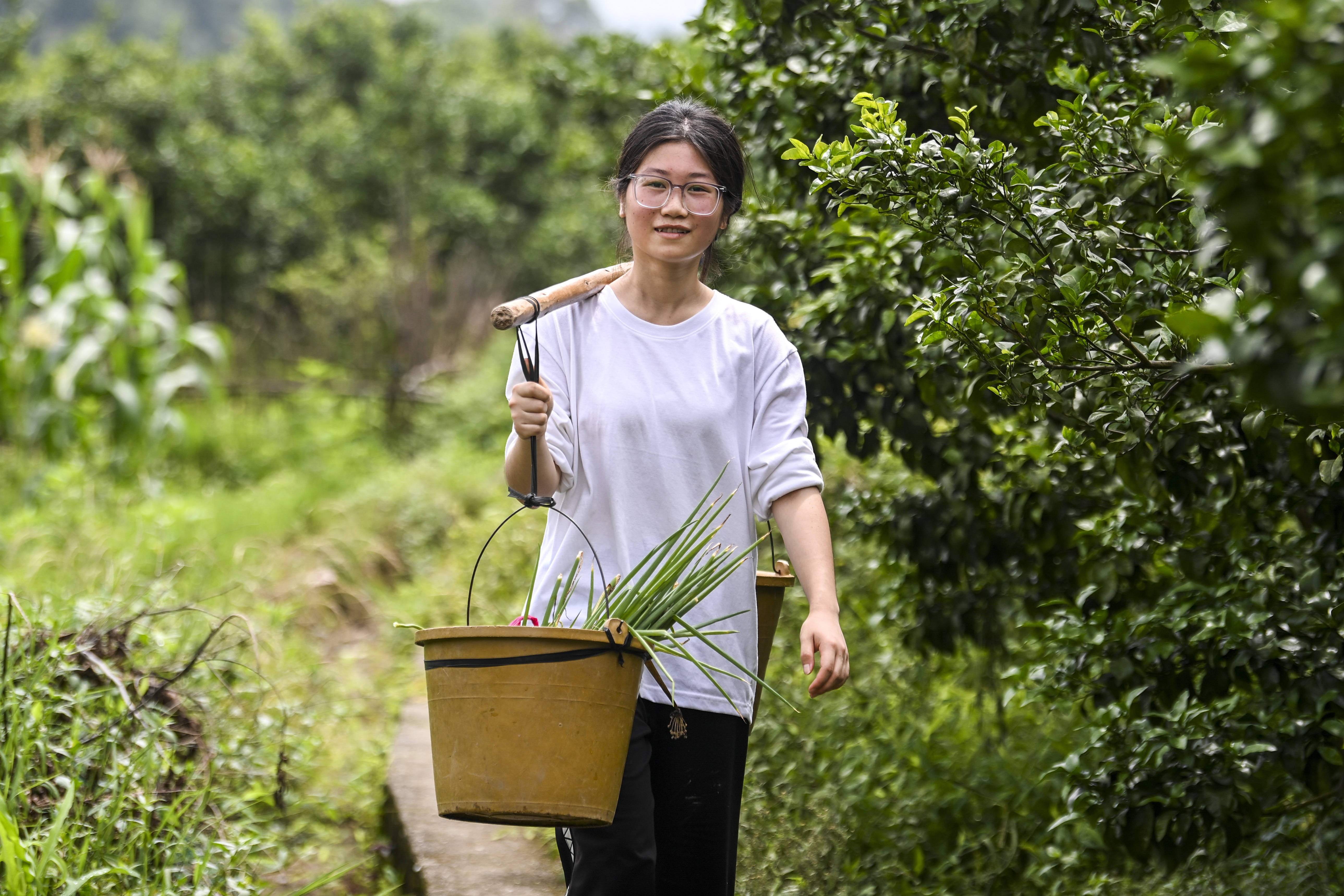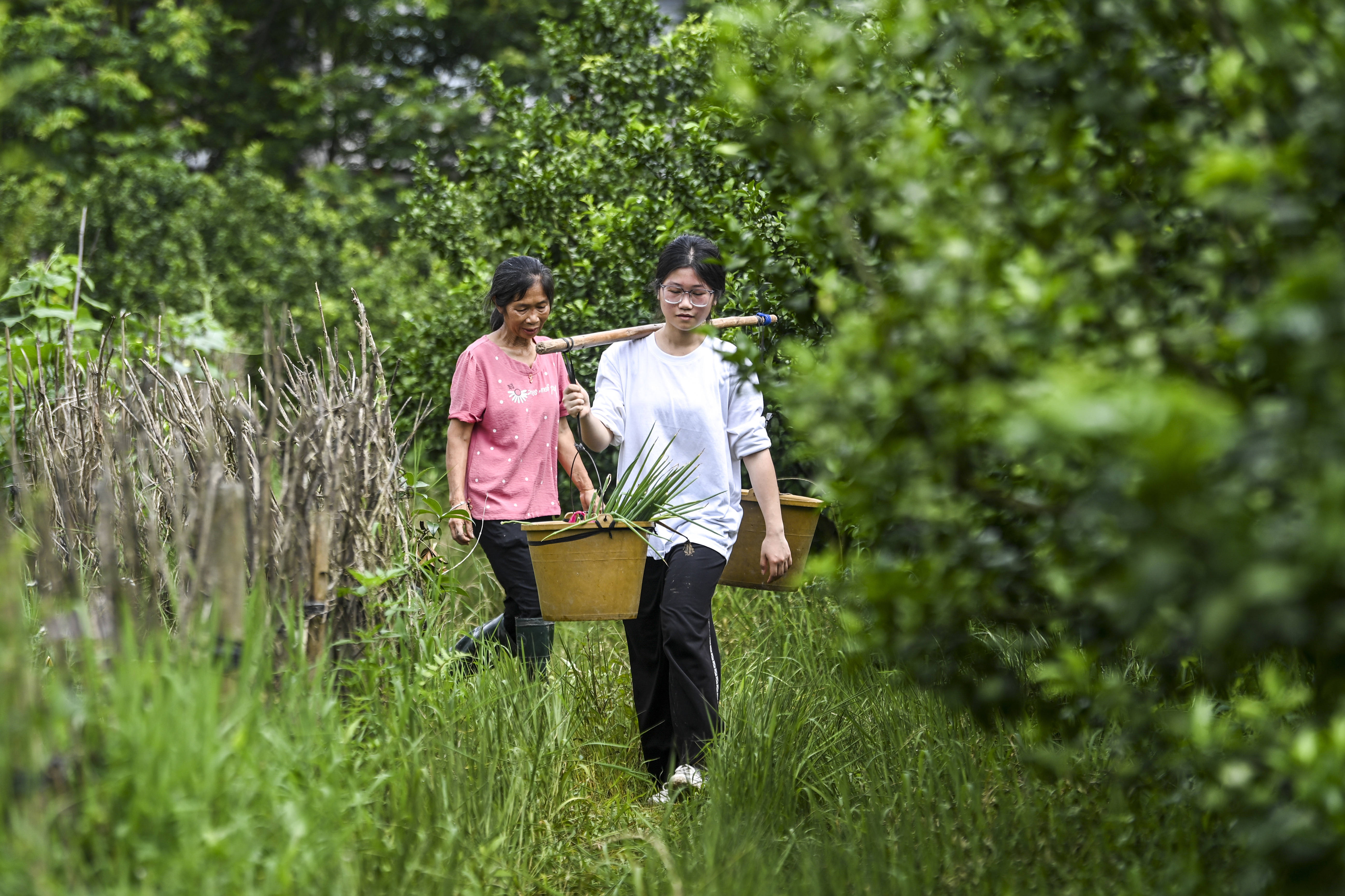 刘燕家的菜地面积不大,蔬菜整整齐齐排列,刚浇过水的菜叶上挂着水珠。给菜地浇完水,她和母亲便准备回家。两人收拾好农具,刘燕自然地挑起扁担。一路上,刘燕的脊背挺直,步子稳健,母亲跟在她身后,脚步不快,两人沿着田埂前行……