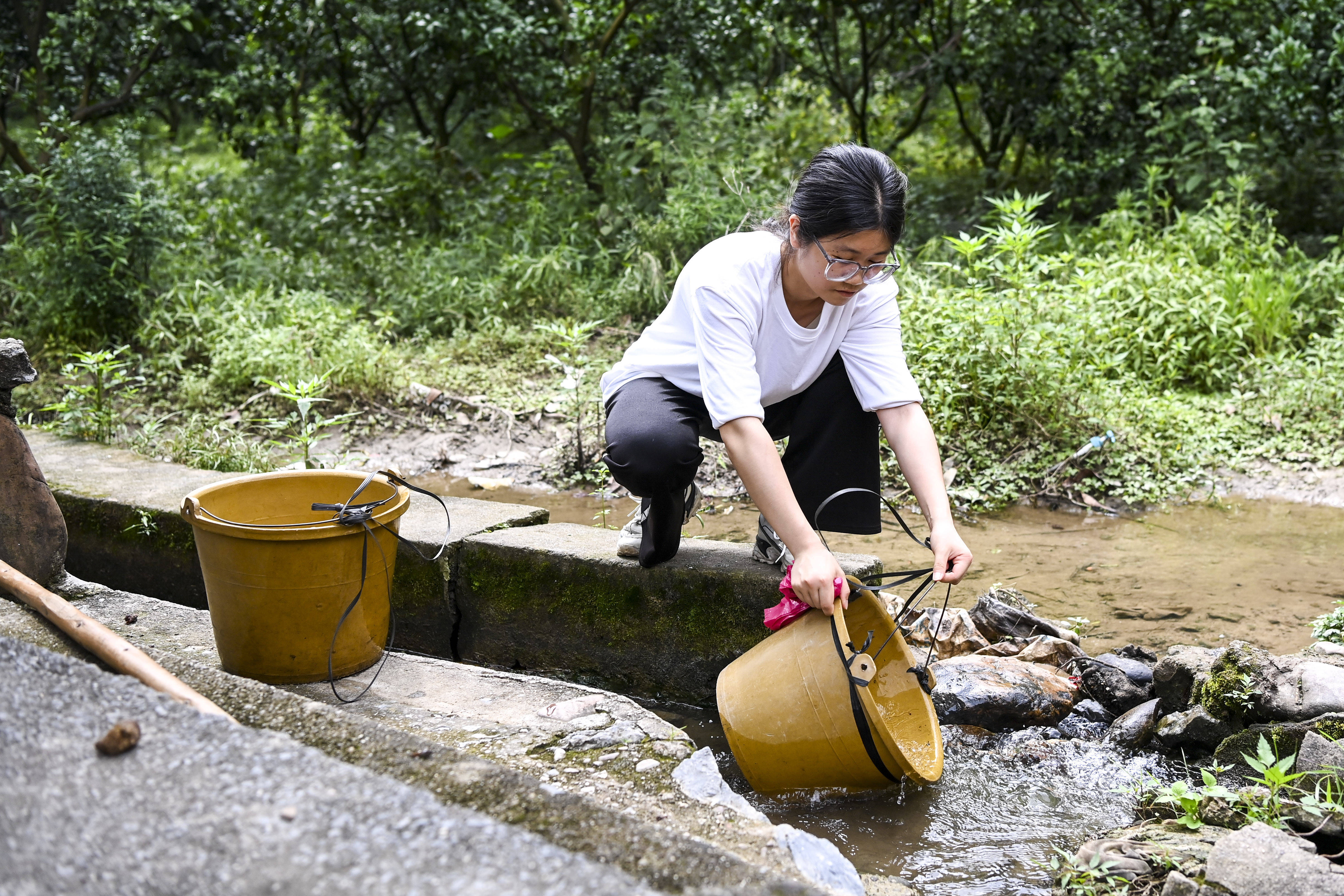 2025年6月13日,刘燕用水桶取水准备给自家菜地浇水。彼时,网上的热度并没有过多影响到刘燕,她每天一如既往地帮妈妈做家务和农活。来到刘燕家的菜地旁,为了避免不必要的干扰,我悄悄蹲在一棵果树下,准备用手中的相机记录下她日常生活的瞬间。