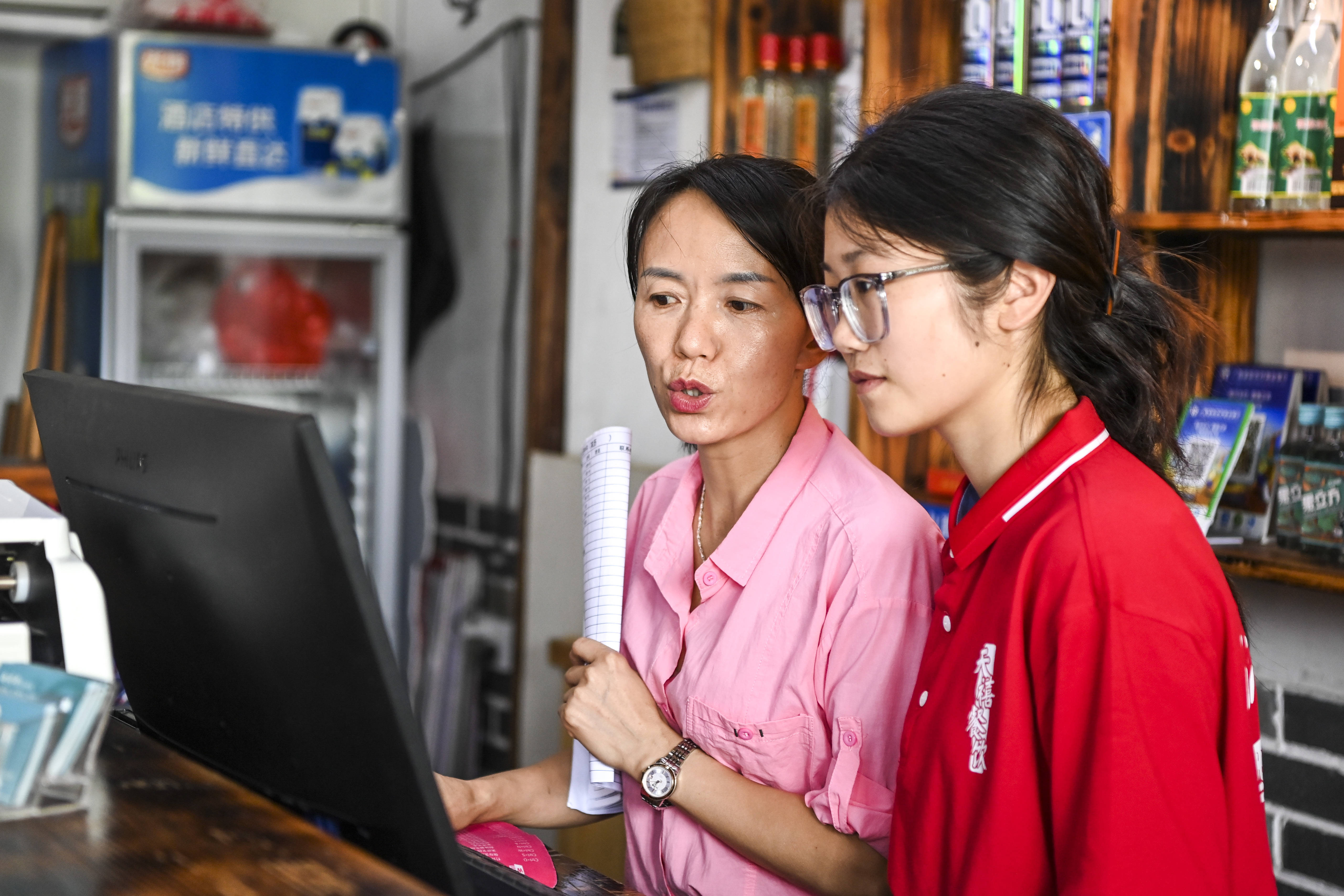 餐馆老板教刘燕使用收银机(2025年6月13日摄)。