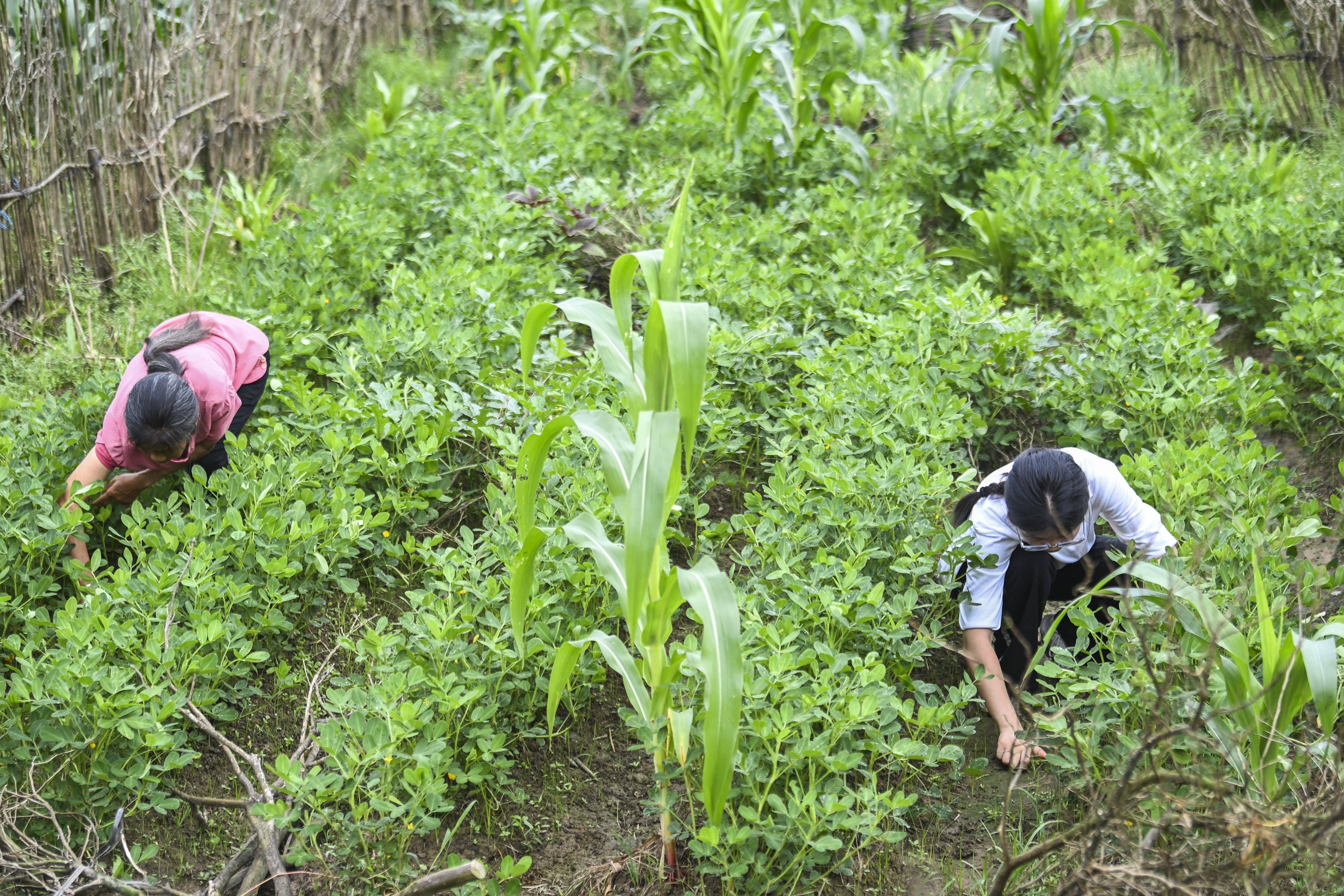 2025年6月13日,刘燕(右)与妈妈一起在自家菜地里除草。