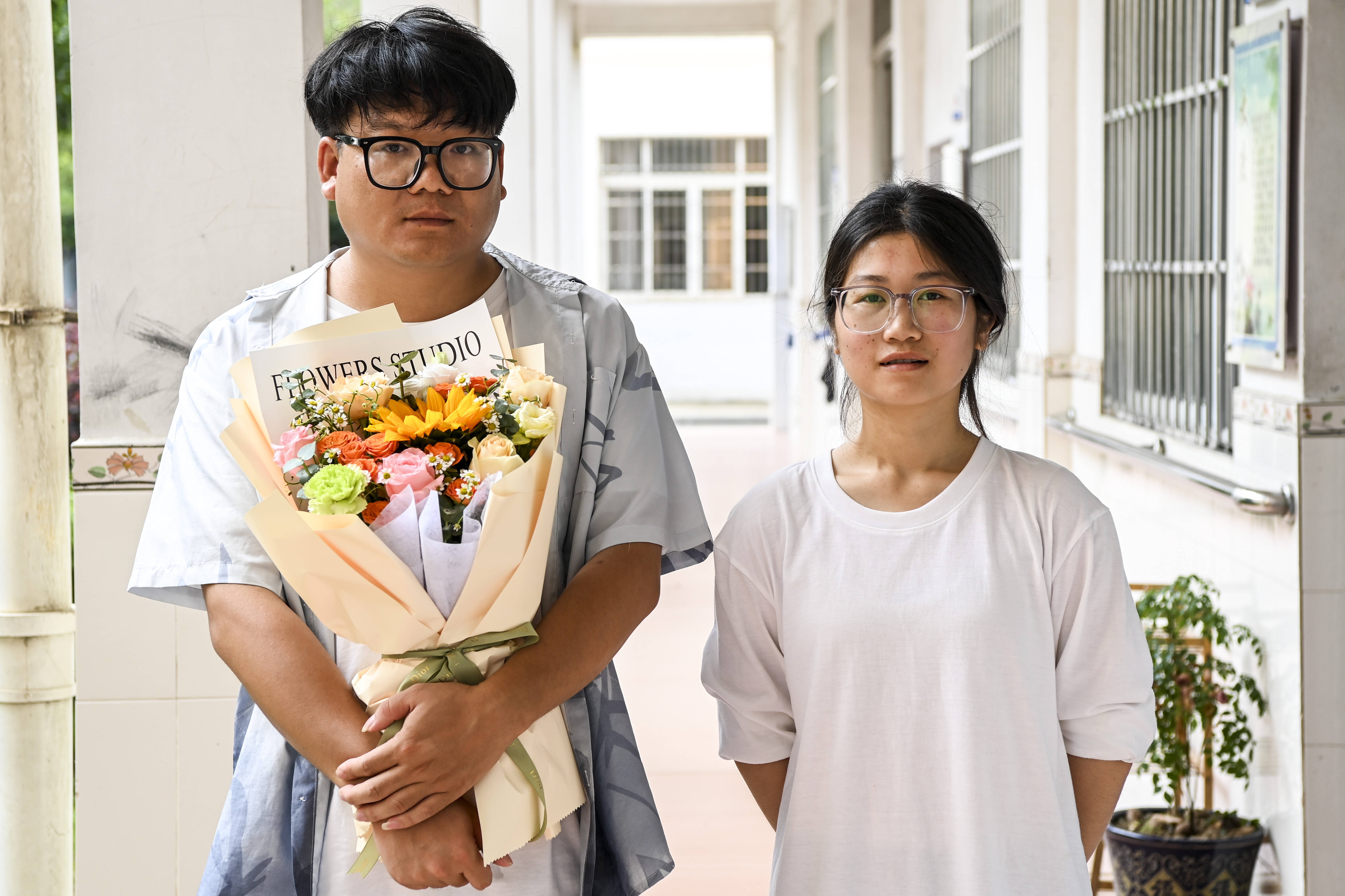 2025年6月13日,在广西桂林市灌阳县第二高级中学,刘燕(右)为班主任陈庆隆送上鲜花后合影。如今,刘燕早已收到录取通知书进入到人生新的阶段,她带给大家的“温暖”和周边人对她的暖心关爱始终未曾消失。